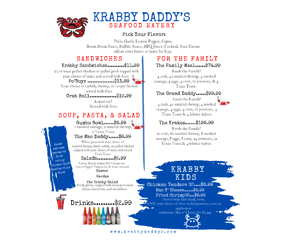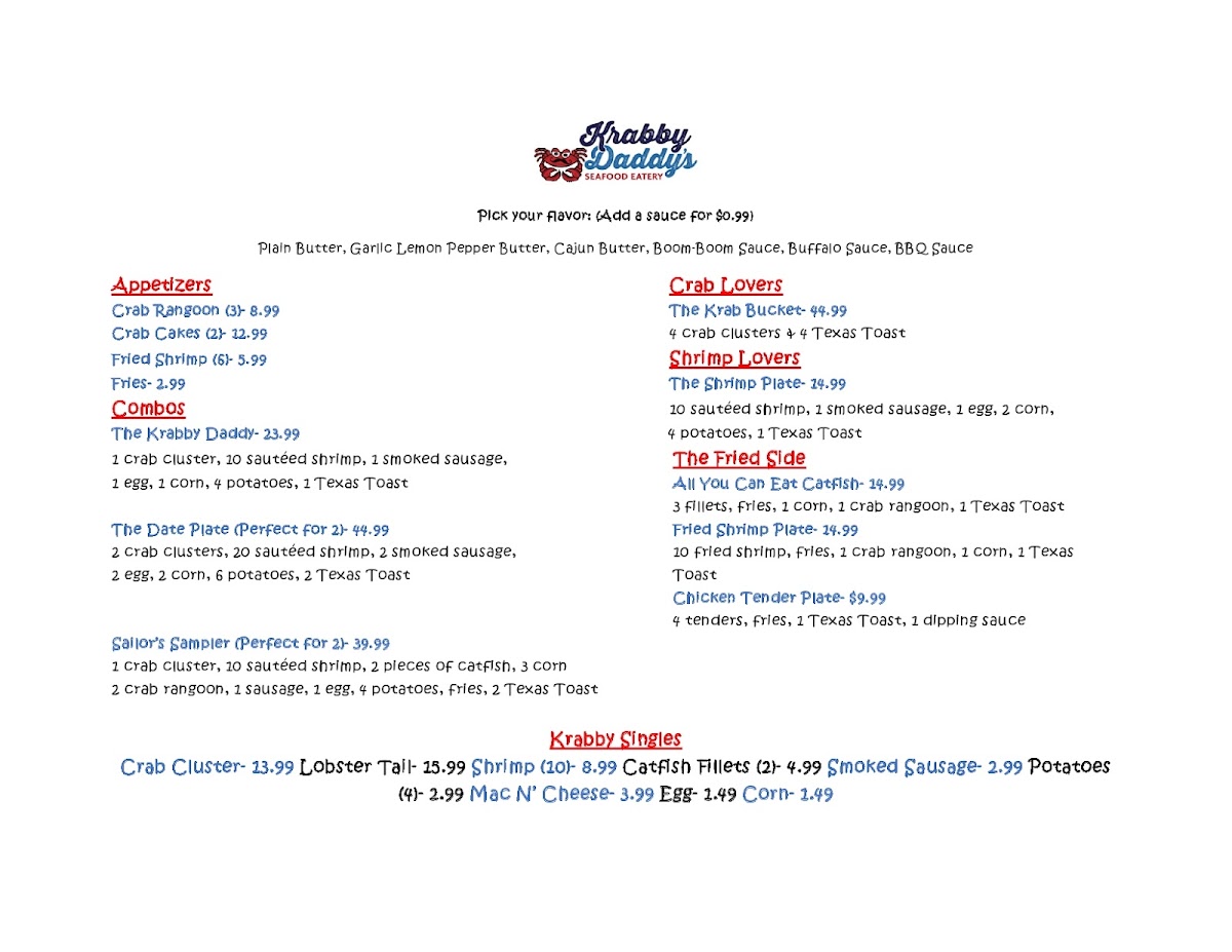 Welcome to Krabby Daddy's Seafood Eatery, a hidden gem nestled in Festus, MO, where seafood lovers can indulge their cravings in delightful ways. The menu is a testament to the culinary treasures of the ocean, featuring mouthwatering options like the 2 LBS of Crab Pieces and The Krab Bucket, filled with succulent clusters. For those starting their meal, the appetizers, like Fried Shrimp and Crab Rangoon, tantalize the taste buds with vibrant flavors.